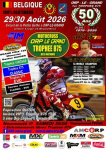 Le Circuit historique de la Petite Gette sera à nouveau le cadre d’un programme exceptionnel ! Encore un 50ème anniversaire à fêter, mais cette fois il s’agit fêter les 50 bougies de la toute première édition du TROPHEE 875, qui s’est tenue le 22 août 1976 et qui fut remportée par Roger DeCoster. Mais aussi, quand on prononce le chiffre “875”, nos pensées ne vont-elles pas immanquablement vers un certain “Mr. 875”, allias “The Kid” ! C’est pourquoi, la mémoire de notre illustre Champion du Monde Eric GEBOERS, alias The Kid, sera également honorée et fera l’objet de toutes les attentions.